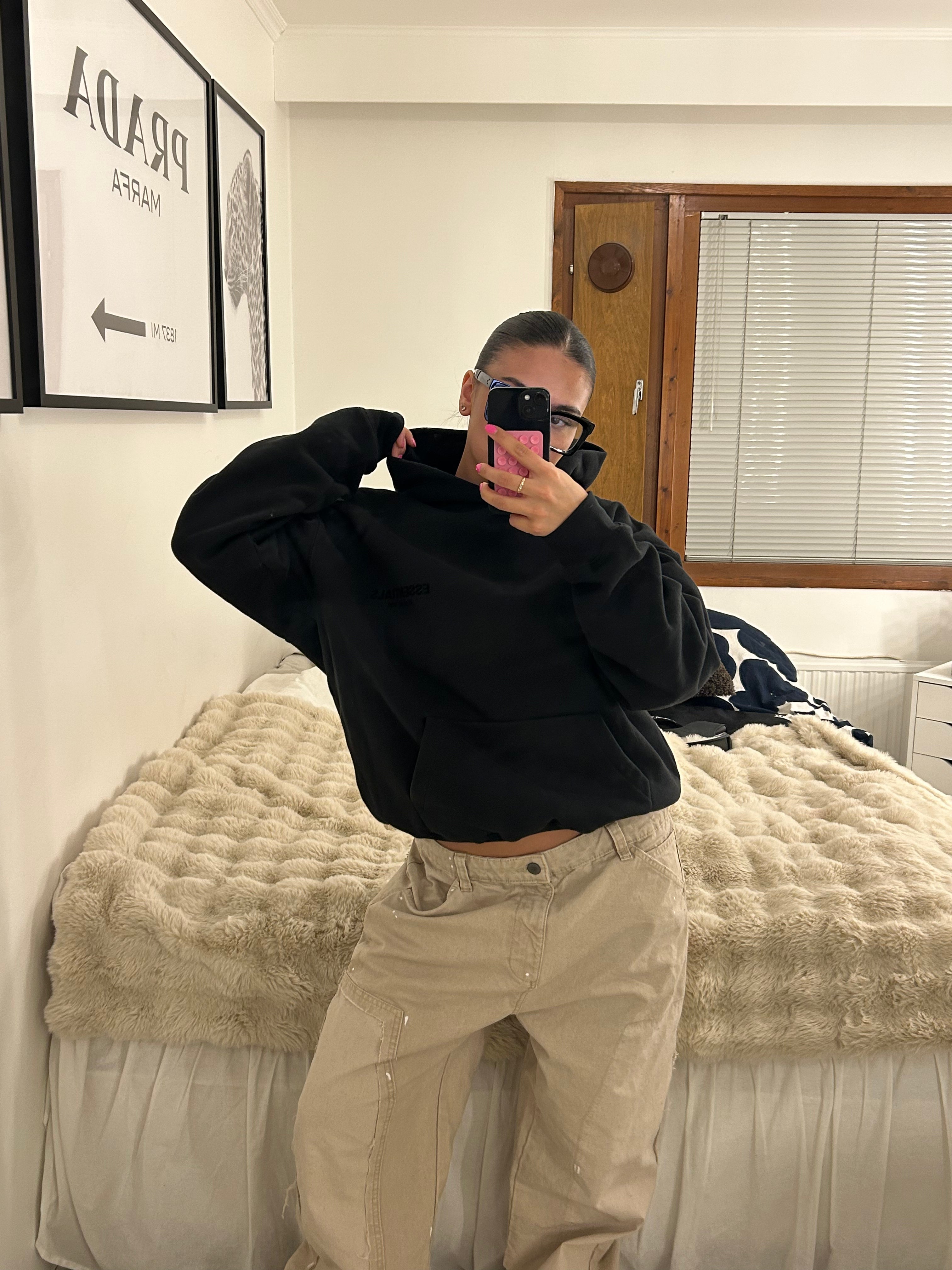 Essentials-Kleidungsstücke sind bekannt für ihre Oversize-Silhouetten, die locker und geräumig am Körper sitzen. Wenn Sie nicht ausdrücklich einen Oversize-Stil anstreben, empfehlen wir Ihnen, eine Nummer kleiner zu wählen.